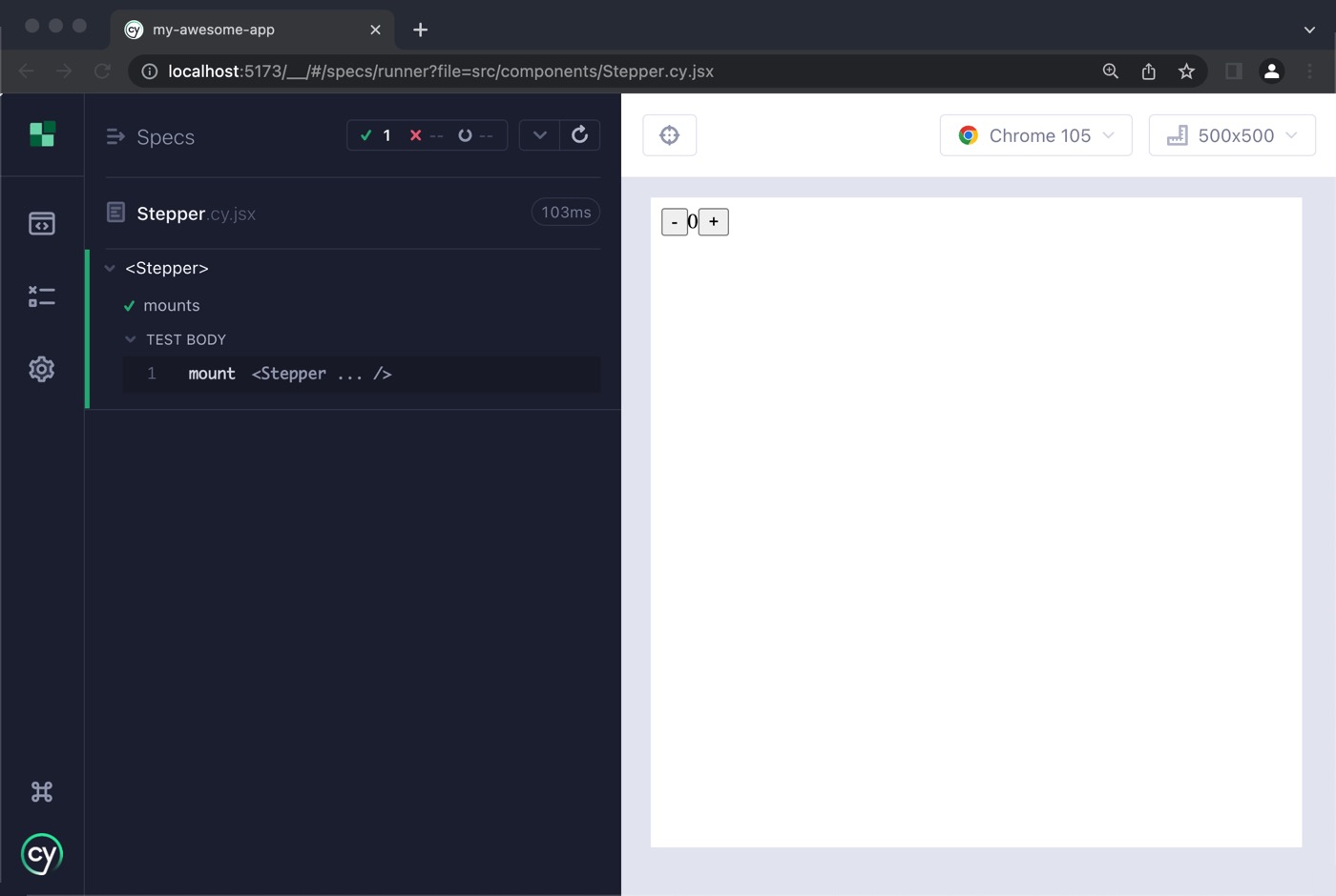 Switch back to the browser you opened for testing, and you should now see the Stepper.cy.jsx file in the spec list. Click it to see the spec execute.